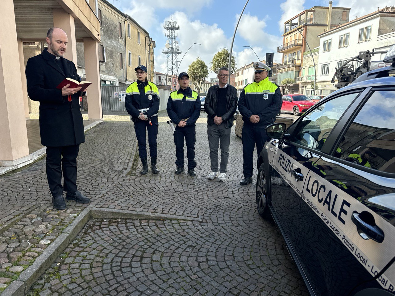 ADRIA – Un nuovo veicolo entra a far parte della dotazione della Polizia Locale di Adria, portando a cinque il numero complessivo dei mezzi a disposizione del comando. L’inaugurazione si è svolta davanti alla sede del comando, ospitata nell’ex tribunale della città, alla presenza del sindaco Massimo Barbujani, del comandante Pierantonio Moretto, alcuni agenti di polizia locale e di Don Nicola, che ha impartito la benedizione al nuovo mezzo.