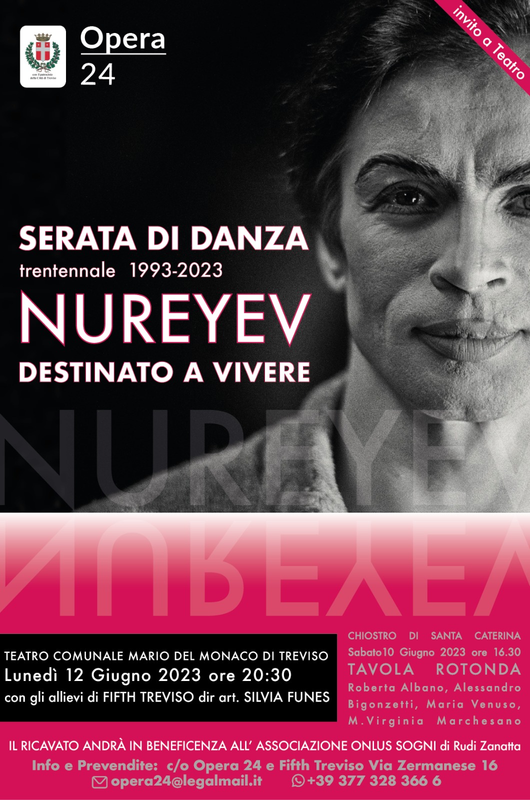 Nel segno del grande ballerino russo, Treviso, con il patrocinio del Comune e il sostegno di tanti Amici di Opera 24, si animerà con convegni e tavole rotonde, stage, danza urbana e una serata di danza finale durante una tre giorni (10-11-12 giugno) intensissima, dove l’allure di Rudolf Nureyev risplenderà ancora una volta sulle tavole del palcoscenico e per le vie della città.