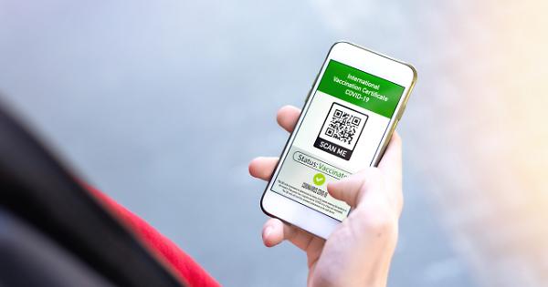 Male hand holding a smartphone with International Vaccination Certificate COVID-19 QR code