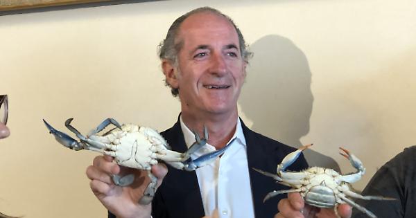 Il presidente del Veneto Luca Zaia ha mostrato due esemplari di granchio blu, un maschio e una femmina, in conferenza stampa