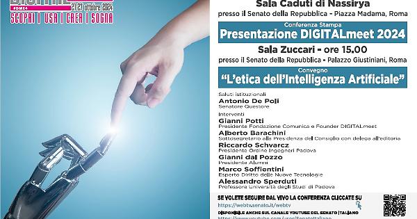 Venerdì 18 ottobre il Senato della Repubblica ospiterà una giornata interamente dedicata alla digitalizzazione e all'intelligenza artificiale. L'iniziativa, promossa dal Senatore Questore Antonio De Poli, fa parte del Digitalmeet, il festival nazionale dell'alfabetizzazione digitale, e vedrà la partecipazione di esperti, accademici e rappresentanti delle istituzioni. La giornata si articolerà in due eventi principali: una conferenza stampa dedicata alla presentazione di una ricerca sulle imprese digitali in Italia e un convegno sull'etica dell'intelligenza artificiale.