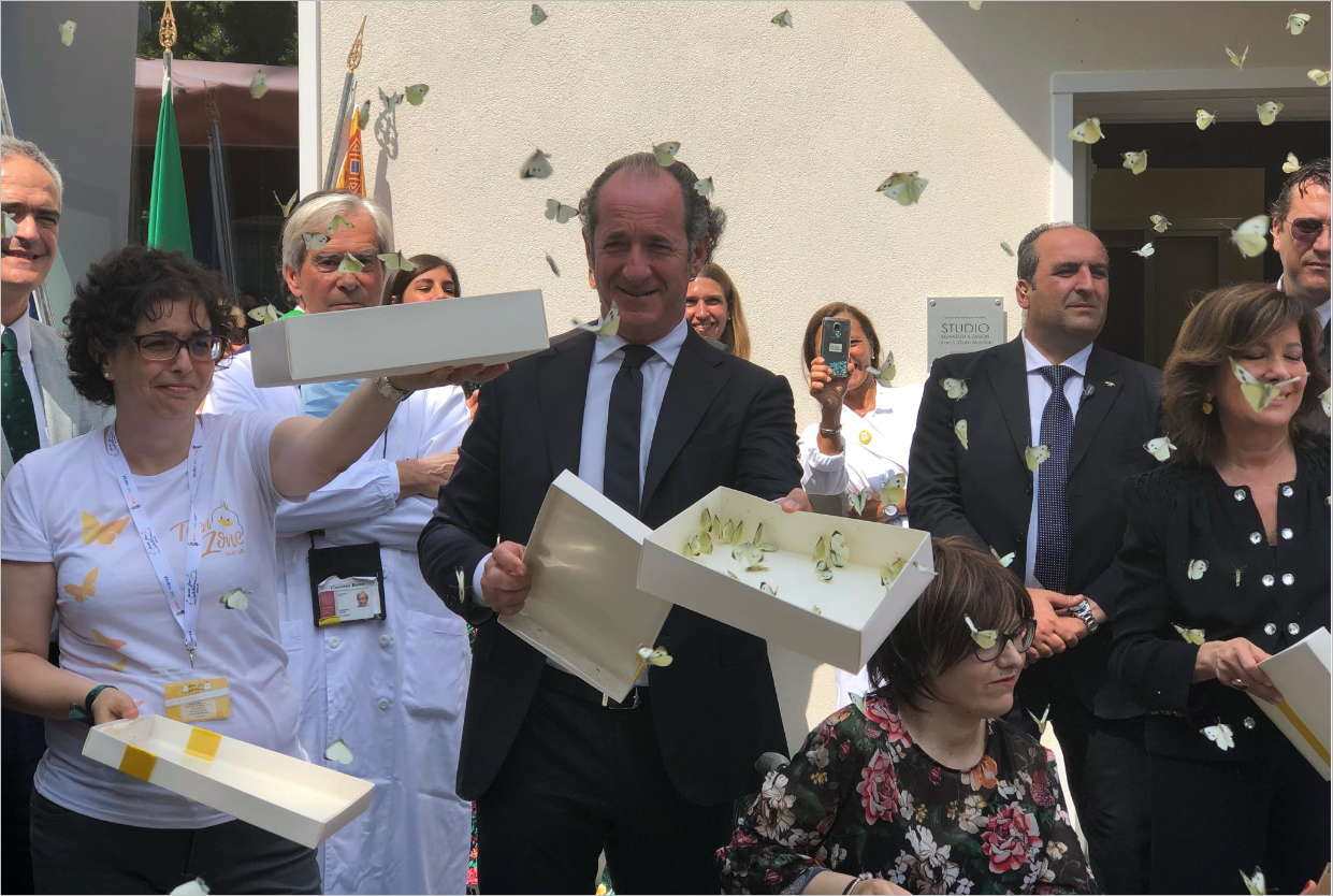“Vi voglio presentare un mastino fatto donna. Senza di lei, la forza e la tenacia, sue e dei volontari di Team For Children, qui oggi non ci sarebbe niente. Dobbiamo solo dire loro grazie e non aggiungere altro, se non che hanno anche saputo sconfiggere le carte, la burocrazia e tutto quanto si è messo di mezzo, perché oggi siamo qui felici per una nuova realizzazione, ma non si creda che non ci siano stati anche dei notevoli freni a mano tirati”. Con queste parole, rivolte alla Presidente dell’Onlus Team For Children Chiara Girello Azzena intervenendo di fronte alla Presidente del Senato Maria Elisabetta Alberti Casellati, al Sindaco di Padova Sergio Giordani, al Rettore dell’Università Rosario Rizzuto, al Primario della Clinica di Oncoematologia Pediatrica dell’Azienda Ospedaliera di Padova Giuseppe Basso e a numerose autorità civili, militari e religiose, il Presidente della Regione Veneto, Luca Zaia, ha salutato l’inaugurazione della Teen Zone di Oncoematologia, realizzata per dare ai ragazzi malati, in particolare quelli tra 14 e 18 anni, una nuovissima area dove socializzare, vivere assieme i tempi del ricovero e, contemporaneamente, ricevere dai sanitari le cure di cui necessitano. Dopo il taglio del nastro infatti, alle autorità sono state consegnate delle scatole che, una volta aperte, hanno liberato decine di farfalle, un momento davvero emozionante perchè simbolo dei bambini e dei ragazzi meno fortunati, che non ce l’hanno fatta e sono diventati farfalle salendo in cielo. “Voi tutti, a partire dai volontari di Team For Children – ha detto la Casellati – insieme ai medici, agli infermieri, agli assistenti e ovviamente ai genitori, siete un bellissimo esempio di solidarietà, di positività pur nelle tante difficoltà, di speranza e di voglia di non fermarsi”. “Spazi come quello che abbiamo inaugurato oggi – ha aggiunto la seconda carica dello Stato – vanno nella giusta direzione di restituire umanità ai luoghi di cura. E’ importantissimo creare aree di condivisione, di comunanza, di solidarietà dove in nostri ragazzi possano sentirsi liberi di vivere, di sognare, di progettare e di farlo stando però insieme". I costi dell’opera sono stati di 350.000 EURO per la struttura e di 150.000 per arredo, ambulatorio, studi medici, materiale informatico. La Teen zone è stata realizzata con il sostegno di privati e aziende del territorio (Acciaiere Venete, Credit Agricole, Daikin, Centro Commerciale Ipercity, Fondazione Umberto Veronesi).