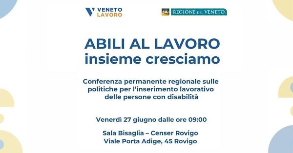 Un confronto ad ampio raggio sulle politiche per l’inserimento lavorativo delle persone con disabilità: è quanto propone la Conferenza permanente regionale, in programma venerdì 27 giugno, dalle ore 9 alle 13, al Centro Congressi CenSer Rovigo Fiere, in Viale Porta Adige 45 a Rovigo. All’evento interverranno l’assessore regionale al Lavoro, Valeria Mantovan, e l’assessore alla Sanità e al Sociale, Manuela Lanzarin.