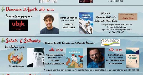Il festival si apre domenica 20 luglio con Angela Tognolini e il suo romanzo “L’inverno della lepre nera”, ospitata presso la Trattoria da Giancarlo a Santa Caterina. Il secondo appuntamento è previsto per domenica 3 agosto nel Bosco di Tretto con Pietro Lacasella e il suo libro “Liberi di sbagliare”, accompagnato dalla cucina del Ristorante Dalla Costa. A settembre il festival propone un doppio evento: il 6 settembre Nicoletta Asnicar intratterrà i più piccoli con “In cima alla montagna”, seguito da Loris Giuriatti che presenterà “Lo chiamavano Alpe Madre”, entrambi accolti dal Ristorante Damarco a Cerbaro. La chiusura è in programma per domenica 14 settembre in contrà Zaffonati con Marco Albino Ferrari e il suo saggio “La montagna che vogliamo”, manifesto per una nuova cultura montana.
