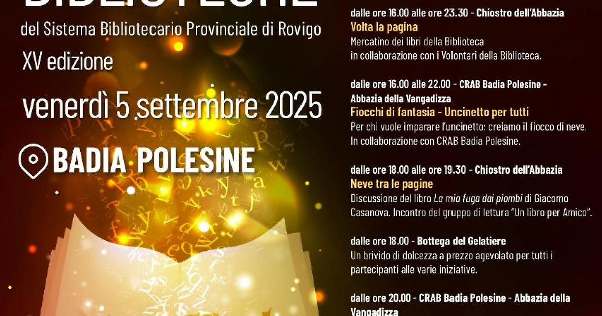 Tutti gli eventi sono a ingresso libero e si svolgeranno nell’area dell’Abbazia della Vangadizza, con accesso da via Cigno e piazza Vangadizza. Un’occasione per scoprire il fascino della lettura in un contesto unico, trasformato per una notte in un paesaggio innevato fatto di libri e storie.