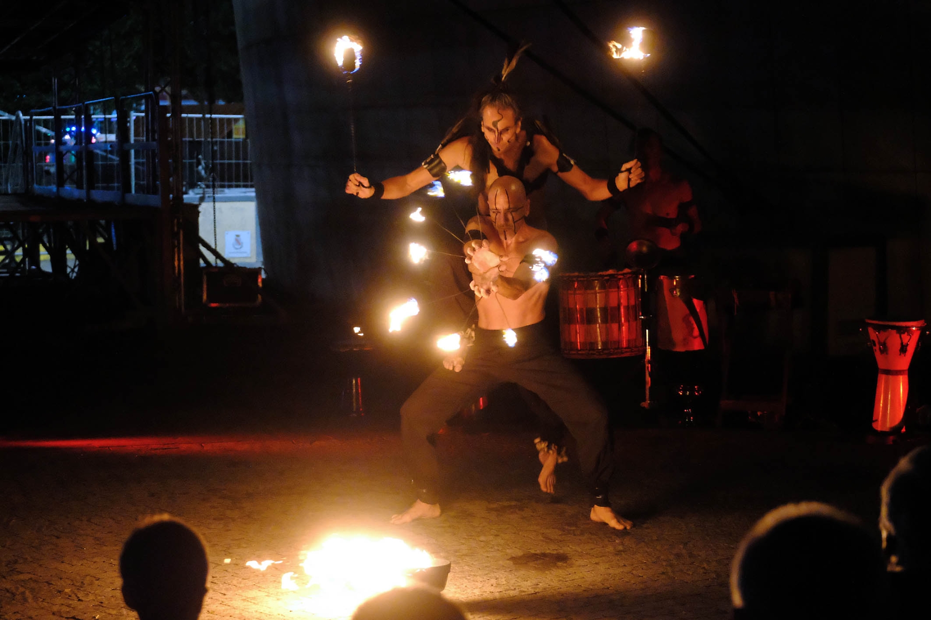 Sfida al maltempo compresa, grazie a una tregua di un’ora, “Ritual de fuego” della compagnia messicana in tournée in Italia, Quetzalcoatl — formata da Francisco Velez Cosgall (danzatore, coreografo e percussionista), Hannibal Canolik (percussionista e batterista) e Raul Somarriba Hernandez (attore, percussionista e batterista) — ha incantato il pubblico presente.