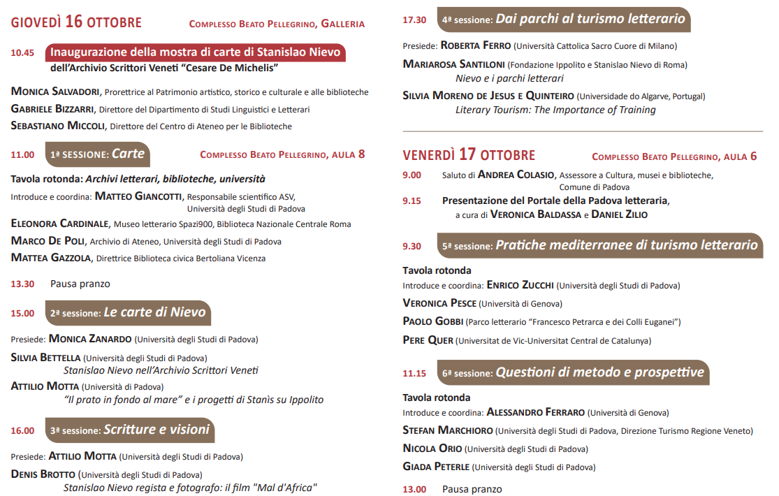 La due giorni si apre giovedì 16 ottobre alle 10.45 presso il Complesso Beato Pellegrino con l’inaugurazione della mostra di documenti originali provenienti dall’Archivio Scrittori Veneti, alla presenza della prorettrice alle attività culturali Monica Salvadori e dell’assessore alla cultura del Comune di Padova Andrea Colasio.
