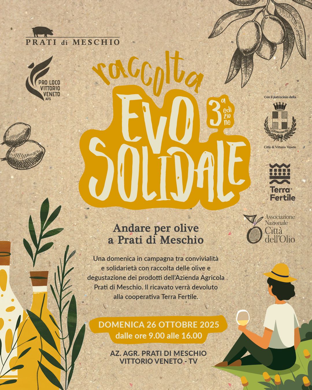 La mattina inizierà presto con una seduta di yoga immersa nel silenzio degli ulivi, seguita da una lettura pubblica del libro di comunità “Nome di battaglia Nero”, proposta dalla Biblioteca di Vittorio Veneto. Dopo una mattinata di raccolta e lavoro condiviso, le olive saranno portate al frantoio della cooperativa Reitia di Cappella Maggiore per la spremitura a freddo, dando vita a un olio extra vergine d’oliva che sarà protagonista delle degustazioni del pomeriggio.