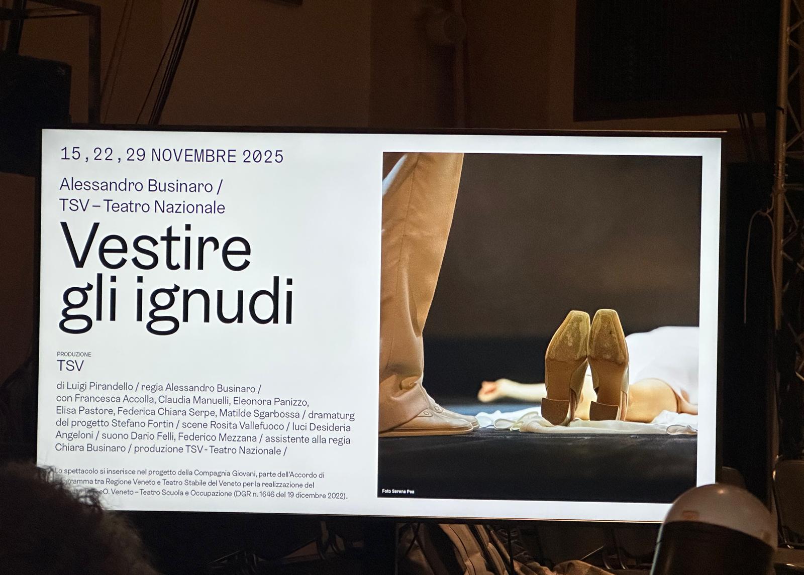 «Per la prima volta presentiamo una stagione completa, con sette titoli fino a gennaio», spiega Alessandro Businaro, direttore artistico junior del TSV. «Accanto a Vestire gli ignudi, ci sono spettacoli contemporanei firmati da alcuni dei talenti più interessanti della scena nazionale, locale e regionale. Tutti condividono una caratteristica: offrono una visione del presente. Anche quando partono da drammaturgie classiche, le riportano alla realtà di oggi. È una stagione viva, vibrante».