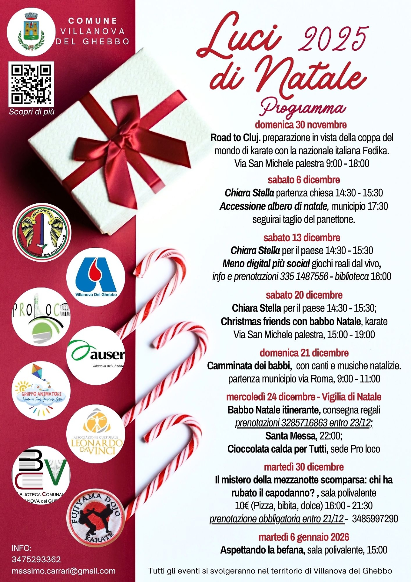 Villanova del Ghebbo si prepara a vivere un Natale speciale grazie a "Luci di Natale 2025", il calendario di eventi che animerà il paese dal 30 novembre 2025 al 6 gennaio 2026. Otto associazioni locali – Pro Loco, AVIS, Parrocchia di San Michele Arcangelo, Fujiyama Dojo Karate, Protezione Civile, AUSER, Biblioteca Comunale e Associazione Leonardo da Vinci – collaborano con il Comune per offrire un programma ricco e variegato, capace di coinvolgere tutta la comunità.