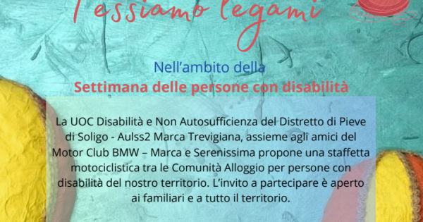 L’Unità operativa Disabilità e Non Autosufficienza del Distretto Pieve, insieme agli enti del terzo settore, alle associazioni dei familiari, ad Anffas e alla Fondazione di Comunità della Sinistra Piave, promuove la terza edizione di “Tessiamo legami”, occasione per mostrare alla cittadinanza il lavoro quotidiano svolto con e per le persone con disabilità e per consolidare collaborazioni sempre più strette.