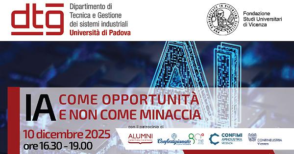 Si parlerà di intelligenza artificiale come risorsa e non come minaccia per il futuro delle imprese vicentine mercoledì 10 dicembre, a partire dalle 16.30, al polo universitario di viale Margherita (sala 8), dove saranno presentati i risultati della ricerca promossa dal Dipartimento di Tecnica e Gestione dei Sistemi Industriali dell’Università di Padova sulle aziende del territorio.