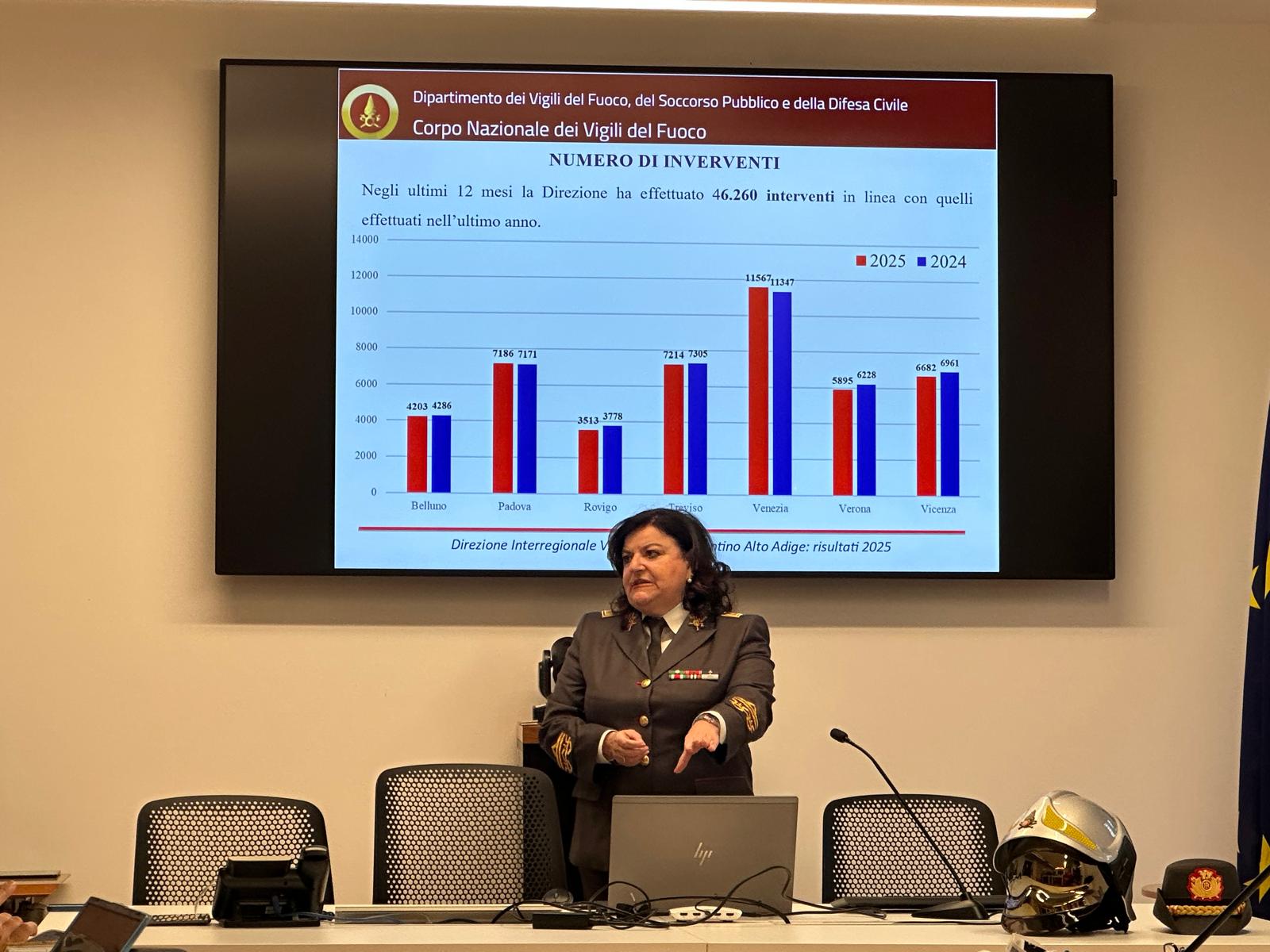 Il 2025 si chiude con un bilancio articolato per i Vigili del Fuoco del Veneto, un territorio vasto e complesso che richiede un lavoro costante di coordinamento, pianificazione e capacità di risposta alle emergenze. A tracciare il quadro è stata questa mattina l’ingegner Cristina D’Angelo, Direttore Interregionale dei Vigili del Fuoco del Veneto e del Trentino Alto Adige, che ha ripercorso un anno intenso, segnato da numeri importanti e da sfide sempre più articolate. La Direzione interregionale svolge un ruolo di regia fondamentale: coordina l’attività dei sette comandi provinciali del Veneto, garantendo uniformità di intervento e standard operativi condivisi, e sovraintende alla gestione delle specialità e delle specializzazioni operative, decisive negli scenari più complessi, dal soccorso in acqua alle operazioni di ricerca sotto le macerie.