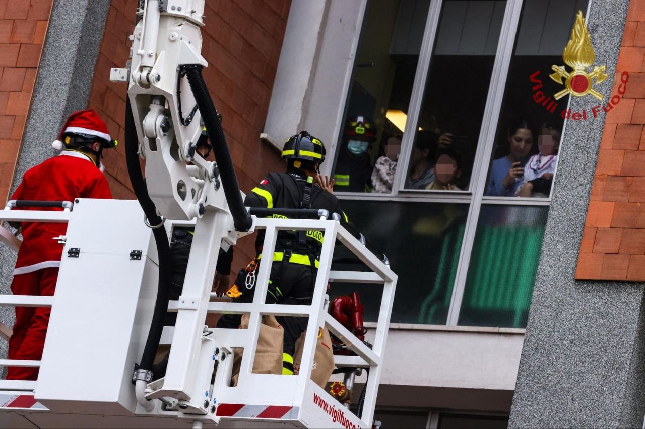 Con un'entrata sorprendente, il “Babbo Natale” Vigile del Fuoco è arrivato calandosi dalla finestra del reparto, a bordo di una slitta meccanica dotata di sirene e lampeggianti, suscitando lo stupore e l’entusiasmo dei piccoli pazienti e delle loro famiglie. Un’entrata scenografica che ha subito catturato l’attenzione di tutti.