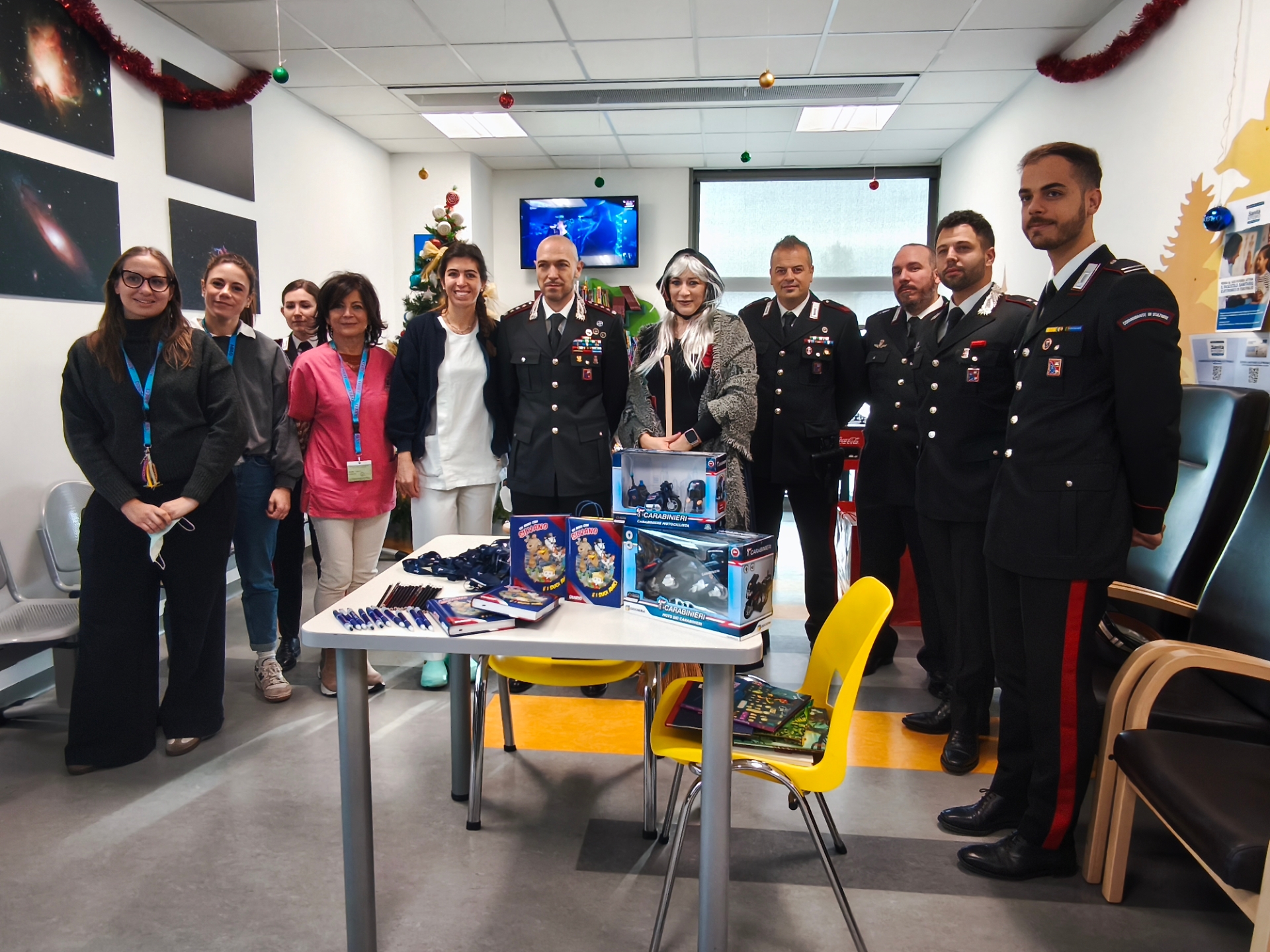 La visita ha toccato diversi reparti del padiglione 30 dell’ospedale: prima l’Oncoematologia pediatrica, poi i reparti di Pediatria C e di Neuropsichiatria infantile. In ogni area la Befana ha consegnato giocattoli pensati per bambini di tutte le età, acquistati grazie alla generosità dei Carabinieri, insieme a piccoli oggetti dell’Arma come penne, matite e diari.