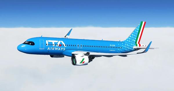 L'airbus A 320 neo con la livrea azzurra e l'insegna della nuova compagnia di bandiera