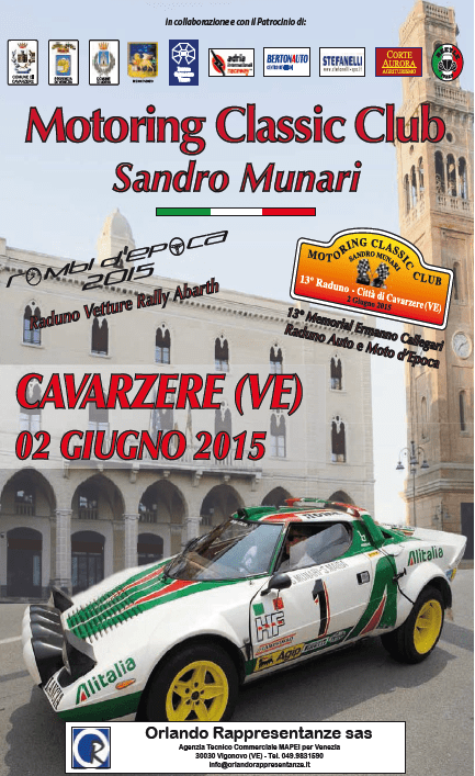 A Cavarzere si stanno scaldando i motori: infatti è il 13° anno che il Motoring Classic Club “Sandro Munari” organizza nella giornata del 2 giugno il “Raduno di Auto e Moto d’Epoca Città di Cavarzere” e quest’anno all’evento si affiancherà il 4° “Raduno Rombi d’Epoca” che sarà dedicato alle autovetture con il marchio Abarth in allestimento da competizione. Tantissime sono le novità di quest’edizione: il comitato organizzatore ha ritenuto opportuno effettuare qualche cambiamento, dettato dall’elevato numero di auto partecipanti (circa 300) agli ultimi raduni, per evitare eventuali problemi nella gestione dell’evento. Per quanto riguarda le auto, la partecipazione sarà riservata ad un numero massimo di 150, inoltre le vetture che potranno partecipare dovranno essere iscritte all’ASI, ad un registro di Marca o aver superato il trentesimo anno di immatricolazione; le iscrizioni avverranno anticipatamente inviando, via e-mail o via fax, il modulo di pre-iscrizione scaricabile dal sito www.motoringclassicclub.it alla sezione “Raduno Auto e Moto”, entro il giorno 27 maggio 2015 (le persone che non hanno dimestichezza con internet potranno recarsi, previo appuntamento, presso la sede del Club in Via L. Einaudi n. 38 a Cavarzere e iscriversi direttamente in loco). Le motociclette, invece, potranno aderire al raduno nella mattinata del 2 giugno e non ci saranno limitazioni al numero di partecipanti, tuttavia dovranno essere state immatricolate prima del 2000 ed avere una cilindrata superiore ai 90 cc., salvo eccezioni per particolari modelli. Per il 4° raduno “Rombi d’epoca”, gli organizzatori hanno dedicato l’evento all’Abarth: la partecipazione sarà quindi riservata ad un numero massimo di 40 vetture Abarth, in versione da competizione del tipo “Rally”. Ospite d’onore della manifestazione, come da tradizione, sarà Sandro Munari, il Drago di Cavarzere, pluricampione automobilistico degli anni ‘70/80. Dopo le iscrizioni per le sole moto ed il ritiro della documentazione di partecipazione delle auto pre-iscritte, procedura che si svolgerà a partire dalle ore 08.30 presso il centro di Cavarzere, alle 10.30 circa ci saranno le partenze per il giro turistico con itinerari diversificati, con una breve sosta per un aperitivo. Alle 13.30 il programma prevede l’arrivo presso l’autodromo “International Raceway” di Adria per il pranzo dei partecipanti, dove verranno effettuate le premiazioni previste e l’estrazione dei premi denominati “Ho guidato la Ferrari F430 Scuderia” e “Ho navigato Sandro Munari”: i fortunati possessori dei numeri estratti potranno guidare, all’interno del circuito, la Ferrari F430 Scuderia e salire a fianco di Sandro Munari. Per l’occasione, il “Drago di Cavarzere”, testimonial della manifestazione, guiderà una vettura ex uffi ciale del gruppo Fiat con cui ha gareggiato durante la sua fantastica e plurivittoriosa carriera. Nel pomeriggio, il piazzale adiacente all’autodromo ospiterà un percorso per una prova di abilità aperta a tutti gli iscritti del Raduno (auto e moto) e vi sarà anche la possibilità di effettuare alcuni giri sul tracciato della pista dell’autodromo, nei quali i partecipanti al Raduno “Rombi d’Epoca” daranno spettacolo con esibizioni di guida sportiva. A completamento del programma della manifestazione, dopo la consueta foto ricordo degli iscritti, l’Adria Karting Raceway, in collaborazione con il Motoring Classic Club Sandro Munari, organizzerà una sfi da di kart: verranno formate batterie di partecipanti (10/15 piloti in relazione al numero di iscritti). Per ulteriori informazioni si può accedere al sito www.motoringclassicclub.it o contattatare telefonicamente le seguenti persone: per il settore auto Fabio Franchin (3357110675) oppure Nicola Gibin (3483650301), per le moto Francesco Pacchiega (3487039090) oppure Sandro Longhin (3351343530). di Nicola Ruzza
