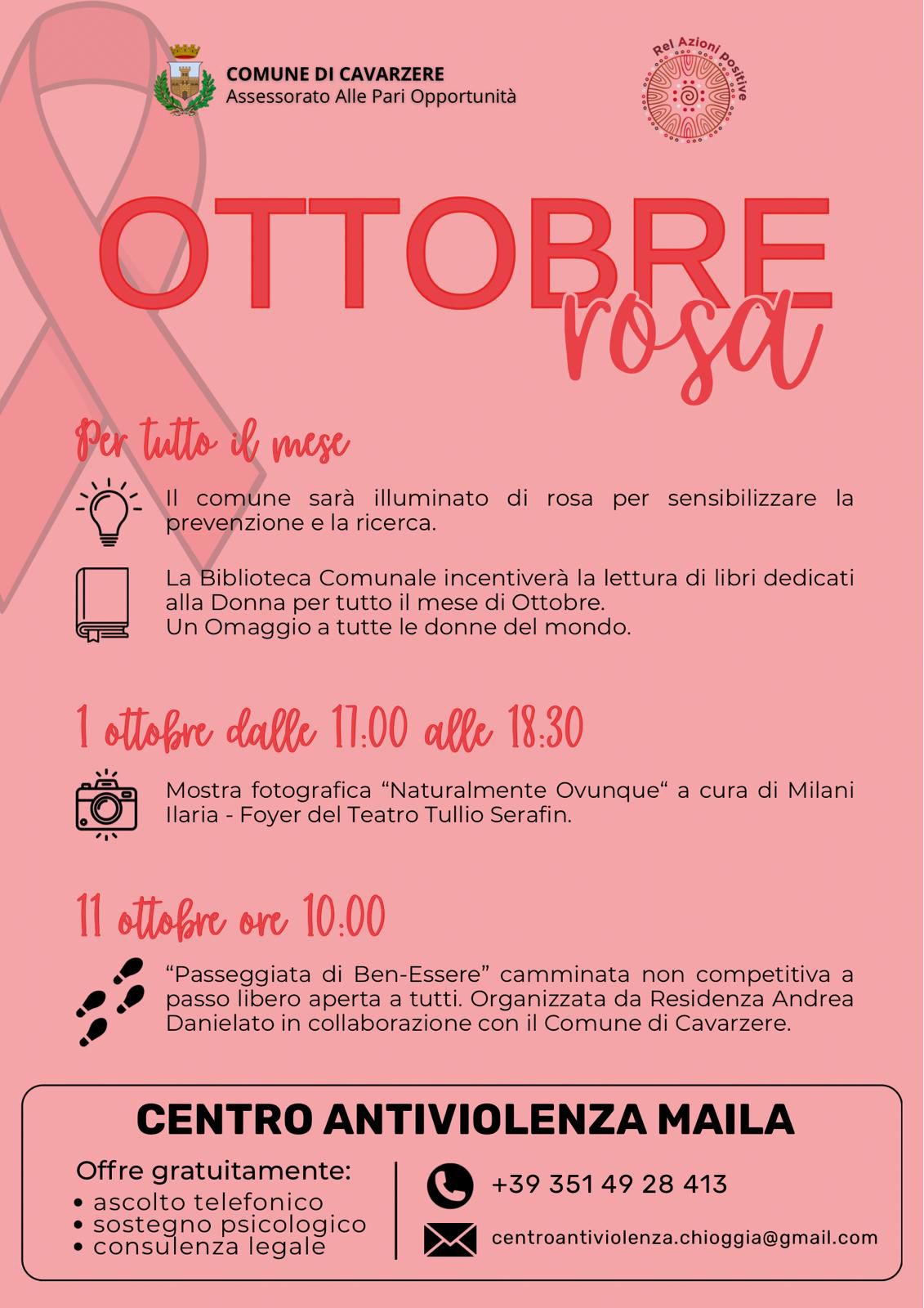 Anche quest’anno il Comune di Cavarzere partecipa a “Ottobre Rosa”, la campagna nazionale dedicata alla prevenzione del tumore al seno e alla promozione della ricerca scientifica.