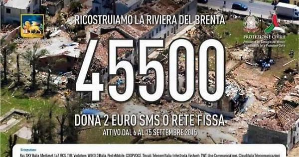Il Comune di Chioggia aderisce all'iniziativa “SMS solidale 45500”, proposta dal presidente della Regione Veneto, Luca Zaia, a favore delle popolazioni della Riviera del Brenta messe in ginocchio dal devastante tornado dello scorso 8 luglio. Fino a martedì 15 settembre, grazie alla collaborazione con il Dipartimento nazionale della Protezione civile, Rai, Sky Italia, Mediaset, La7, Rcs, Tim, Vodafone, Wind, 3 Italia, PosteMobile, CoopVoce, Tiscali, Telecom Italia, Infostrada, Fastweb, Twt, Uno Communications, Clouditalia Telecomunicazioni, sarà attivo il numero telefonico 45500 per gli sms solidali e le chiamate da rete fissa. Con una semplice chiamata o un sms al 45500, sarà possibile devolvere 2 euro per la ricostruzione della Riviera del Brenta, offrendo una mano tesa a chi ha perso tutto. Il sindaco Giuseppe Casson ha fatto propria l'iniziativa e ha dato disposizione che venisse pubblicizzata sul sito istituzionale del Comune.GIVE EMOTIONS SRL | C.F. e P.IVA 04385760287 REA PD-385156 | Reg. Tribunale di Padova n. 2516
