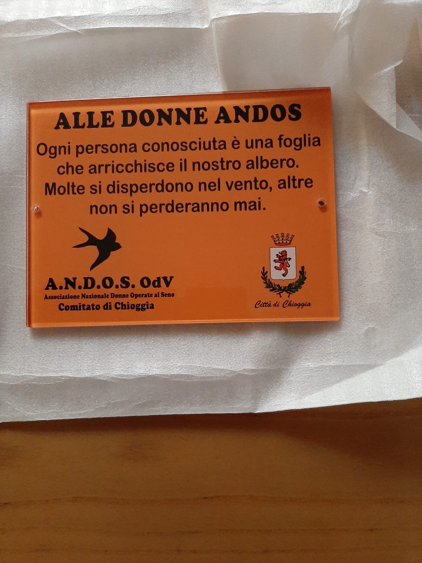 Il 29 ottobre 2025 in piazza Todaro a Sottomarina sarà affissa la targa magnolia Andos: “Ogni persona conosciuta è una foglia che arricchisce il nostro albero. Molte si disperdono nel vento, altre non si perderanno mai.” E’ una dedica a tutte le donne Andos, quelle che non sono più con noi e quelle che, dopo la malattia, ritrovano forza ed entusiasmo in ogni nuovo giorno. Il 12 ottobre il Municipio di Chioggia era stato illuminato di arancio, il colore del sole e della rinascita.