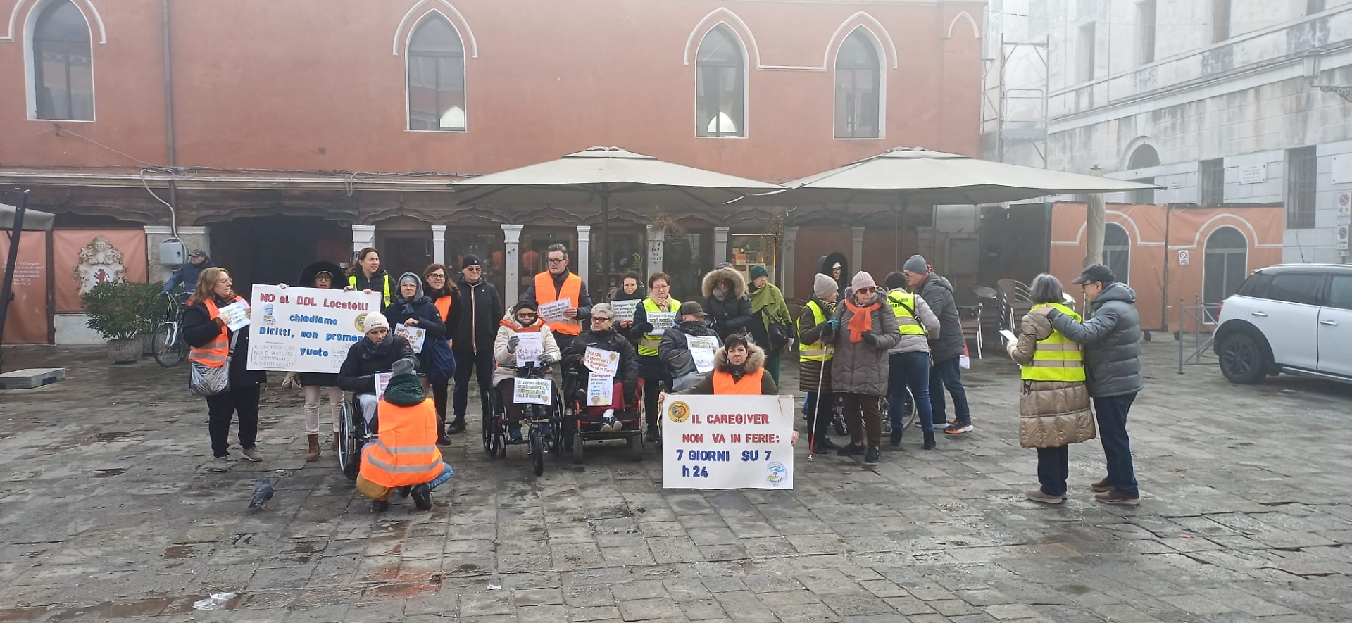 Alcune associazioni (Comitato Insieme si può APS, Sorridiamo Insieme, UILDM Chioggia, ANFFAS Chioggia, il Sorriso e la Speranza, Stelle sulla Terra, Prometeo) e varie persone si sono riunite martedì 27 gennaio 2026 in piazzetta Granaio a Chioggia per rispondere all’appello del movimento CFU (Caregiver Familiari Uniti) che ha organizzato un presidio a Roma in Piazza Santi Apostoli e successivamente una conferenza stampa presso la Camera dei Deputati: in piazza non per chiedere pietà, ma dignità.