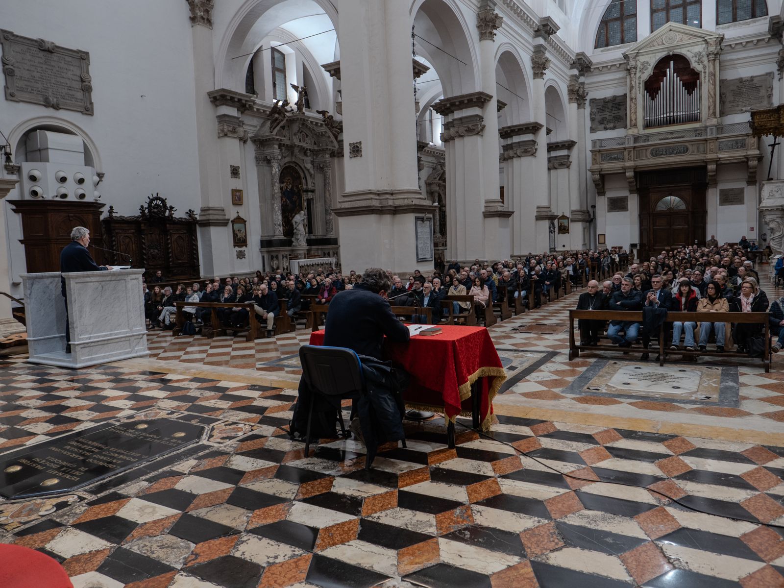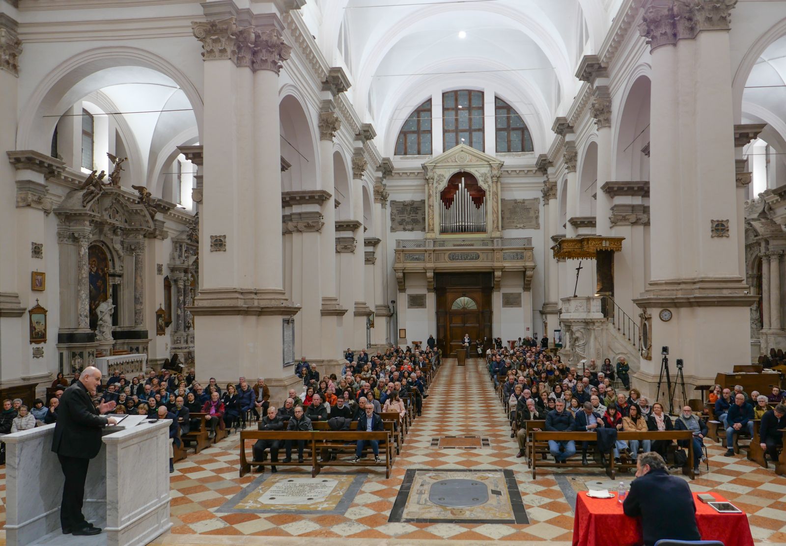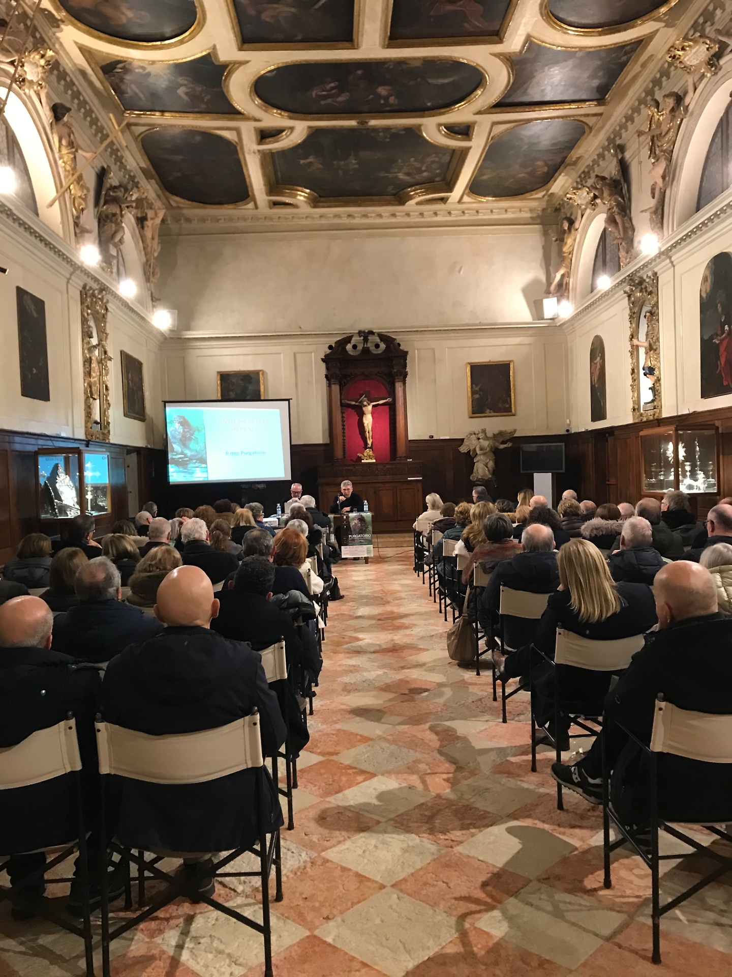 A presentare la mostra costituita da 33 pannelli che raccontano il cammino di Dante per raggiungere la felicità e la salvezza si sono avvicendati gli studenti delle classi terze dell’Istituto “D. Cestari” e del Liceo “G. Veronese” nell’ambito delle attività di FSL (Formazione Scuola Lavoro) e i volontari che hanno accompagnato oltre un centinaio di gruppi prenotati ed altre decine di visitatori. A dispetto dei limiti, delle fatiche, delle crisi, delle difficoltà che si vivono, il Purgatorio offre la possibilità di ripartire perché si può essere perdonati, come ha spiegato Franco Nembrini che ha affrontato il tema "Ricominciare sempre...il mistero del male, la grazia del perdono” nell’incontro del 20 marzo 2026 nella Cattedrale di Chioggia alla presenza di 500 persone: “Tutto può ricominciare, rinascere; tutti abbiamo il desiderio che la vita rinasca. Dante ha visto il bene, il vero e anche noi dobbiamo imparare a ‘vedere’”. La serata si è conclusa con il saluto del sindaco di Chioggia Mauro Armelao e la benedizione del vescovo mons. Giampaolo Dianin. Il Centro Culturale Terzo Millennio ha già annunciato di proseguire il viaggio di Dante con la mostra “Il mio Paradiso”, prevista nel 2027, ma anche di organizzare nell’autunno di quest’anno una mostra dedicata al papa Giovanni Paolo I. (e.f.)