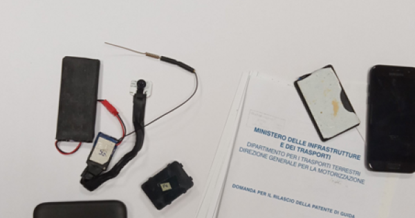 I due sono stati trovati in possesso di strumentazione informativa ed elettronica per falsare la prova d’esame, perfettamente funzionante, in grado di riprendere le domande dei quiz e trasmetterle ai complici posti a distanza, così da farsi suggerire le risposte esatte. La strumentazione era accuratamente occultata sotto la maglietta e fissata al corpo con nastro adesivo.