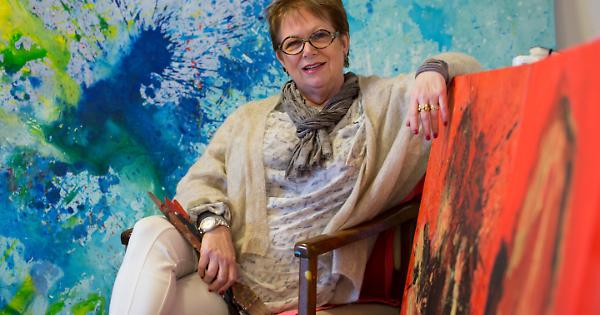 Foto della pittrice Carla Rigato insieme ad alcune delle sue opere