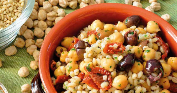 Con il caldo non si ha voglia di stare ai fornelli, vi proponiamo allora un’insalata d’orzo con ceci, pomodori secchi e olive taggiasche: un piatto unico vegetariano da gustare freddo!