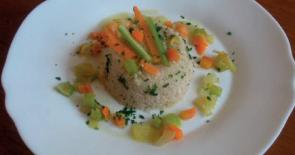 Ingredienti: 300 gr di cuscus - acqua - 2 cipolle - 2 carote - 1 porro o 2 zucchine - 2 spicchi d’ aglio - un rametto di rosmarino - olio - sale Preparazione: lavare e affettare le carote, i porri e le cipolle; mettere la cipolla in una teglia con poco olio e farla rosolare, aggiungere poi le carote, i porri o le zucchine, unire anche l’aglio schiacciato e il rosmarino, salare, coprire e stufare per 15 minuti circa a fiamma moderata. A parte tostare il cuscus, coprire poi con l’acqua necessaria e portare a termine la cottura. Dopo aver spento, lasciare riposare un pò, aggiungere le verdure stufate e lasciare insaporire.