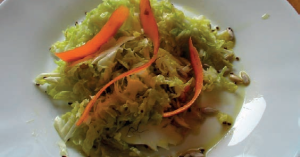 Ingredienti: 600 g di cavolo cappuccio - 80 g di olive nere snocciolate - 2 C di semi di cumino - 4 C di limone - 2 C di olio - sale q. b. Preparazione: lavare il cavolo, eliminare il torsolo e affettarlo a striscioline sottili. Tritare le olive e unirle al cavolo, aggiungere il succo di limone, l’olio, il sale e i semi di cumino. Lasciarlo macerare 10 minuti prima di servire. Carmen Bellin