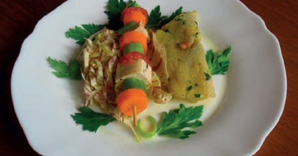 Ingredienti: 2 carote - ½ finocchio - 4 ravanelli - 2 coste di sedano - 10 cm. di radice di daikon o sedano rapa - 4 foglie di lattuga - olio e sale q. b. - 1 1 pizzico di curry - ½ limone - 1 punta di c di senape. Preparazione: pulire e tagliare a dadini di circa 1 cm tutte le verdure, avendo cura di condire ogni tipo in una apposita ciotola. Prendere i bastoncini e infilare i vari tipi di verdura alternando i colori. Quindi servirli sulla foglia di lattuga. Carmen Bellin
