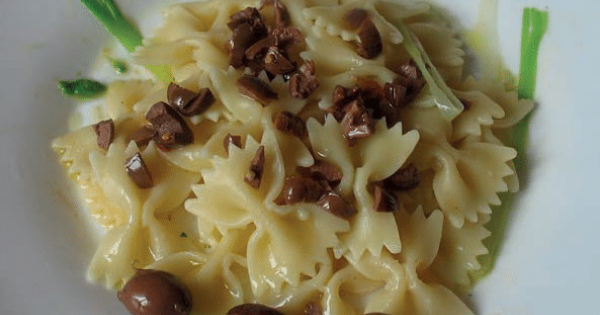 Ingredienti: 320 g di farfalle - 10 olive nere - 5 olive verdi - ½ limone - 10 pomodorini piccoli - 1 pizzico di prezzemolo e di erba limoncina - 30 g di olio - sale - peperoncino