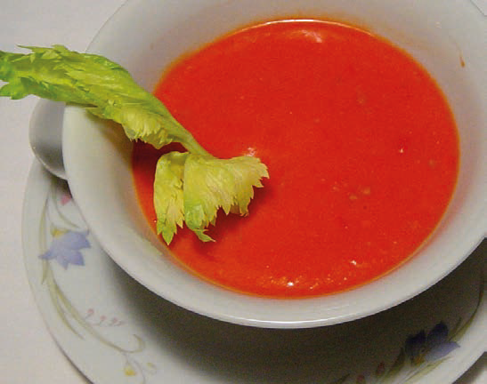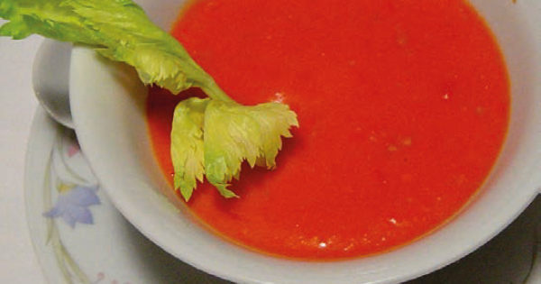 Ingredienti: 4 pomodori rotondi ben maturi 1 cipollotto 1 cetriolo 1 peperone rosso 1 spicchio d’aglio sale 1 pizzico di origano 1 pizzico di peperoncino piccante 1 C di olio Preparazione: lavare le verdure e tagliarle grossolanamente a pezzi. Versarle in un frullatore capiente (o utilizzare il frullatore a immersione dentro una pentola) insieme all’origano, al peperoncino, al sale e all’olio crudo. Frullare fino ad ottenere una crema omogenea. Servire ben fresco.