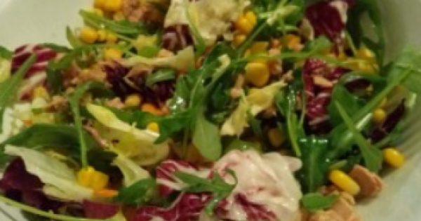 Ingredienti:- ½ cavolo cappuccio - 2 carote - ½ caspo di lattuga - 4 C di mais in chicco - Tonno in scatola - 1 C di gomasio - olio, sale e limone q. b.Preparazione: Lavare le verdure, tagliare il cavolo cappuccio il più sottile possibile, grattugiare le carote, spezzettare la lattuga, aggiungere il tonno e condire separatamente. Porre il mais al centro del piatto.