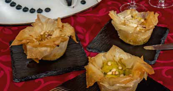 La pasta fillo è un ingrediente tradizionalmente utilizzato nella cucina mediorientale, che può essere impiegato per realizzare secondi piatti o antipasti originali. Piatti che si possono realizzare anche con il Bimby. Scopriamo, ad esempio, come preparare un delizioso manicaretto che può ben impressionare gli ospiti delle feste. Mescolate nel boccale del Bimby la panna, il parmigiano reggiano grattugiato, sale, pepe, le uova e i tuorli. Avviate a velocità 5 e frullate per 1 minuto. Dividete la pera in 4 spicchi, sbucciateli, eliminate le parti di torsolo e affettateli, dividendo poi le fettine a metà; quindi irroratele con succo di limone. Sbucciate i topinambur, irrorateli con succo di limone, metteteli nel recipiente del Bimby e tritateli grossolanamente per 20 secondi a velocità 5. Procedete allo stesso modo con la cipolla. Aggiungete nel Bimby una noce di burro, un filo di olio, sale e pepe e rosolate la cipolla tritata a 100°C in senso antiorario per 2 minuti. Aggiungete i topinambur e cuocete allo stesso modo per altri 5 minuti; poi regolate di sale e pepe e profumate con l’origano. Tagliate la patata a cubetti e metteteli nel cestello del Bimby. Inserite il cestello nel boccale e aggiungete una quantità di acqua sufficiente a sfiorare il fondo del cestello e avviate a temperatura Varoma per 15-20 minuti a seconda della dimensione dei cubetti. Condite i cubetti di patate con il pesto e un filo di olio. Tagliate la pasta fillo con le forbici in quadrati di 10-12 cm di lato. Sciogliete 80 g di burro nel boccale del Bimby a 80°C, velocità 3 per 1-2 minuti. Spennellate di burro fuso 4 fogli di pasta fillo, disponendoli uno sull’altro e sistemateli in uno stampino individuale del tipo usa e getta spennellato di burro; procedete allo stesso modo, preparando altri 11 cestini, facendo sempre fuoriuscire le punte di pasta fillo. Riempite 4 tartellette, che avrai lasciato negli stampini con pere, noci e qualche cubetto di Asiago. Riempite altre 4 tartellette con i topinambur e quindi con le mandorle a lamelle. Riempite infine le ultime 4 tartellette rimaste con le patate al pesto, qualche ciuffetto di crescenza e qualche pinolo. A questo punto dovrete versare in ciascuna tartelletta un po’ di composto di panna e uova, senza eccedere ma solamente per coprire a filo il ripieno. A questo punto i saccottini possono essere infornati a na temperatura di 180°C per un tempo di cottura di circa 15-20 minuti. Una volta adeguatamente dorati possono essere serviti in tavola.GIVE EMOTIONS SRL | C.F. e P.IVA 04385760287 REA PD-385156 | Reg. Tribunale di Padova n. 2516