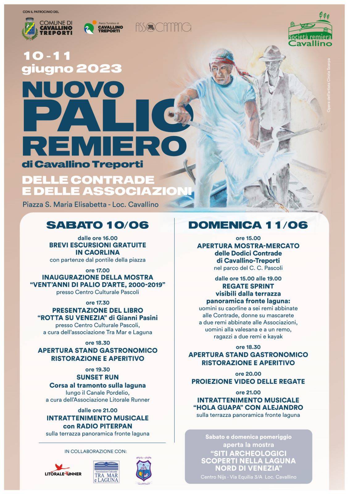 «Il Palio d’Arte apre tutte le attività legate al “Nuovo Palio Remiero” delle Contrade e delle Associazioni, con un nuovo significato. Nelle mani della Remiera Cavallino si plasma quindi questa edizione che però ha radici lontane perché nasce proprio dal cuore di una Remiera, da ideali sportivi che però sono trasversali a tutto ciò che riconduce al territorio – ha aggiunto l’assessore allo sport Targhetta -. Ringraziamo la Remiera Cavallino per aver raccolto il testimone e per aver fatto rete con le altre associazioni locali per realizzare l’evento ma soprattutto per portare avanti la tradizione del remo a Cavallino-Treporti. Un segnale importante di questa edizione del Palio è il numero dei numerosi giovani regatanti: più di settanta atleti si sfideranno a colpi di remo nel Canale Pordelio». Il programma: Sabato 10 giugno: dalle ore 16.00 brevi escursioni gratuite in caorlina con partenze dal pontile della piazza; ore 17.00 inaugurazione della mostra “Vent’anni di Palio d’Arte, 2000-2019” presso Centro Culturale Pascoli; ore 17.30 presentazione del libro “Rotta su Venezia” di Gianni Pasini presso Centro Culturale Pascoli, a cura dell’associazione Tra Mar e Laguna; ore 18.30 apertura stand gastronomico ristorazione e aperitivo a cura della Contrada di Cavallino in collaborazione con la parrocchia di Ca’ Vio; ore 19.30 Sunset Run - Corsa al tramonto sulla laguna lungo il Canale Pordelio, a cura dell’Associazione Litorale Runner; dalle ore 21.00 intrattenimento musicale con Radio Piterpan sulla terrazza panoramica fronte laguna. Domenica 11 giugno: ore 15.00 apertura mostra-mercato delle Dodici Contrade di Cavallino-Treporti nel parco del Centro Culturale Pascoli; dalle ore 15.00 alle 19.00 regate sprint visibili dalla terrazza panoramica fronte laguna: uomini su caorline a sei remi abbinate alle Contrade, donne su mascarete a due remi abbinate alle Associazioni, uomini alla valesana e a un remo, ragazzi a due remi e kayak; ore 18.30 apertura stand gastronomico ristorazione e aperitivo a cura della Contrada di Cavallino in collaborazione con la parrocchia di Ca’ Vio; ore 20.00 proiezione video delle regate; ore 21.00 intrattenimento musicale “Hola Guapa” con Alejandro sulla terrazza panoramica fronte laguna. In occasione del Palio sabato e domenica pomeriggio è aperta anche la mostra “Siti archeologici scoperti nella Laguna Nord di Venezia” presso il Centro Nijs.