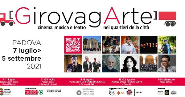 Dal 7 luglio Piazza Azzurri d’Italia accoglierà la prima serata dedicata al cinema all’aperto organizzato da Cinerama, rassegna curata da Marco Segato. Un viaggio nella storia della commedia cinematografica americana dal 1955 al 1966. Cinque commedie classiche, cinque capolavori del grande maestro del cinema Billy Wilder. Si parte con la pellicola “Quando la moglie è in vacanza” (Usa, 1955). GirovagArte prosegue giovedì 8 con lo spettacolo dedicato alle famiglie “Fagiolino e l’asino d’oro” della compagnia Teatro del drago; venerdì 9 serata musicale dell’Orchestra di Padova e del Veneto. Sabato 10 luglio la compagnia teatrale Le Brugole presenta ”#pourparler - un viaggio attraverso le parole”. Infine, domenica 11 luglio, l’associazione Vox Artes propone alle 18 una passeggiata culturale tra storia e contemporaneo con un occhio alla street art. Le altre piazze che verranno calcate da truck e artisti sono: piazzale Cuoco dal 21 al 25 luglio, parcheggio Parco Brentella dal 4 al 8 agosto, parcheggio Parco Iris dal 18 al 22 agosto e per chiudere in piazza Barbato dal 1 al 5 settembre. Tra gli appuntamenti da non perdere il 23 luglio alla Guizza (Piazzale Cuoco) il gruppo a cappella più noto del panorama italiano “Neri per caso”; sabato 24 luglio sarà la volta di Jacopo Fo e la performance teatrale “Com’è esser figlio di Franca Rame e Dario Fo”. Il parco Iris accoglierà giovedì 19 agosto Moni Ovadia e la sua “Lectura Dantis”. A settembre protagonista Ponte di Brenta (piazza Barbato) con lo spettacolo, venerdì 3 settembre, di Paolo Jannacci&Band, un viaggio nelle note del padre Enzo, una delle figure più carismatiche della scena artistica italiana. Il 5 settembre la manifestazione si chiuderà con una sintesi perfetta di divulgazione e spettacolo con il duo televisivo Mario Tozzi e Lorenzo Baglioni con il loro “Al clima non ci credo” nel quale affrontano uno dei temi globali più urgenti e pressanti. Spazio dedicato alle famiglie, la proposta GirovagArte junior, in collaborazione con Arci, Barabao Teatro, SpazioDanza e Fantaghirò. Tutte le domeniche dalle ore 16:30 alle 19:00 quattro parchi diversi ospiteranno laboratori e performance: Parco Milcovich l’11 luglio, campo dei Girasoli il 25 luglio, Parco degli Alpini l’8 agosto e Parco Iris il 22 agosto. Il programma completo è disponibile sul sito ufficiale www.girovagarte.com e sulla pagina facebook @GirovagartePadova