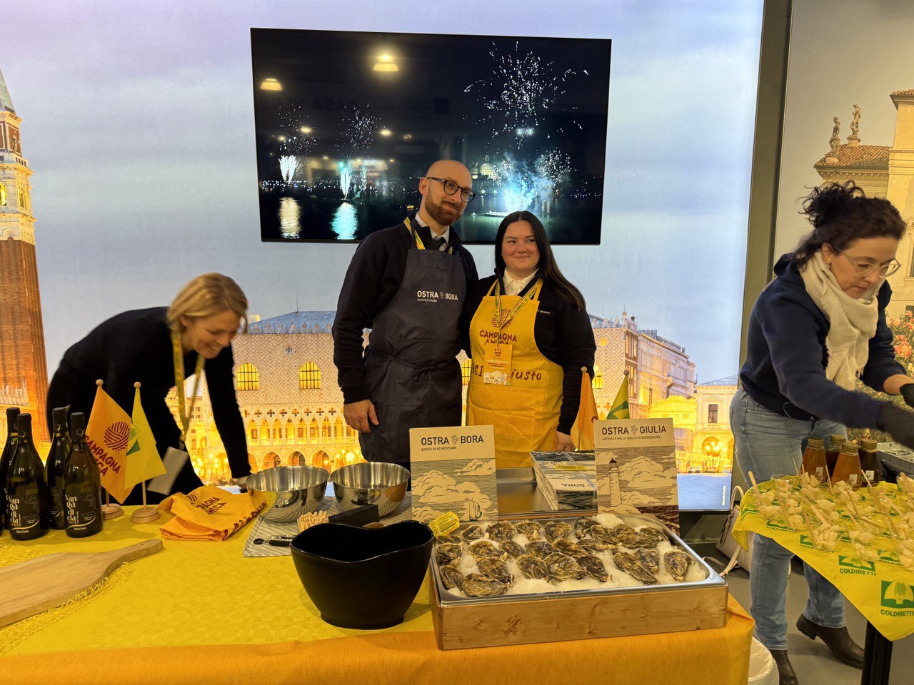 In occasione delle Olimpiadi Invernali, Casa Veneto ha ospitato i produttori Polesani Coldiretti. Ostriche, mieli premiati, vini Mattarella, Turchetta e Basegana e prodotti dell’erba medica hanno raccontato la passione delle famiglie e il legame con il territorio, accompagnati dalle note delle ocarine di Benvenuto Fecchio e la moglie Giuseppina di Grillara, località di Ariano nel Polesine
