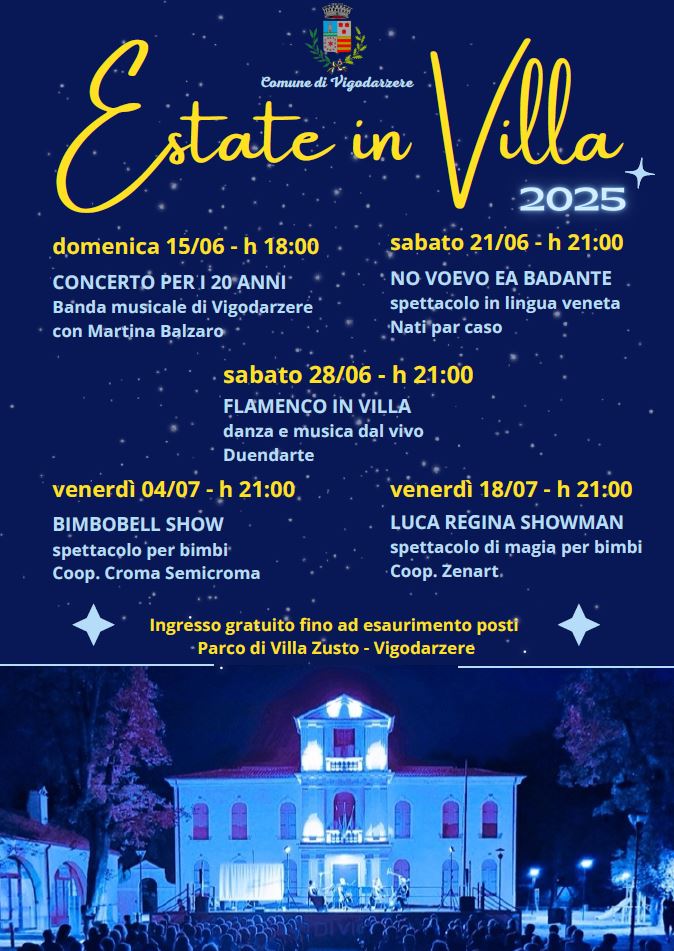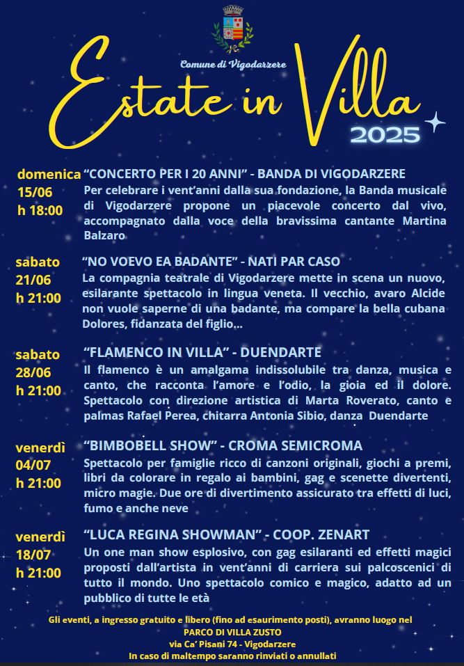 La rassegna Estate in Villa 2025 rappresenta un’occasione imperdibile per riscoprire la cultura, il divertimento e la bellezza di Vigodarzere, con eventi per tutti i gusti e per tutte le età. L’ingresso gratuito e il fascino del parco di Villa Zusto rendono ogni serata unica e speciale.
