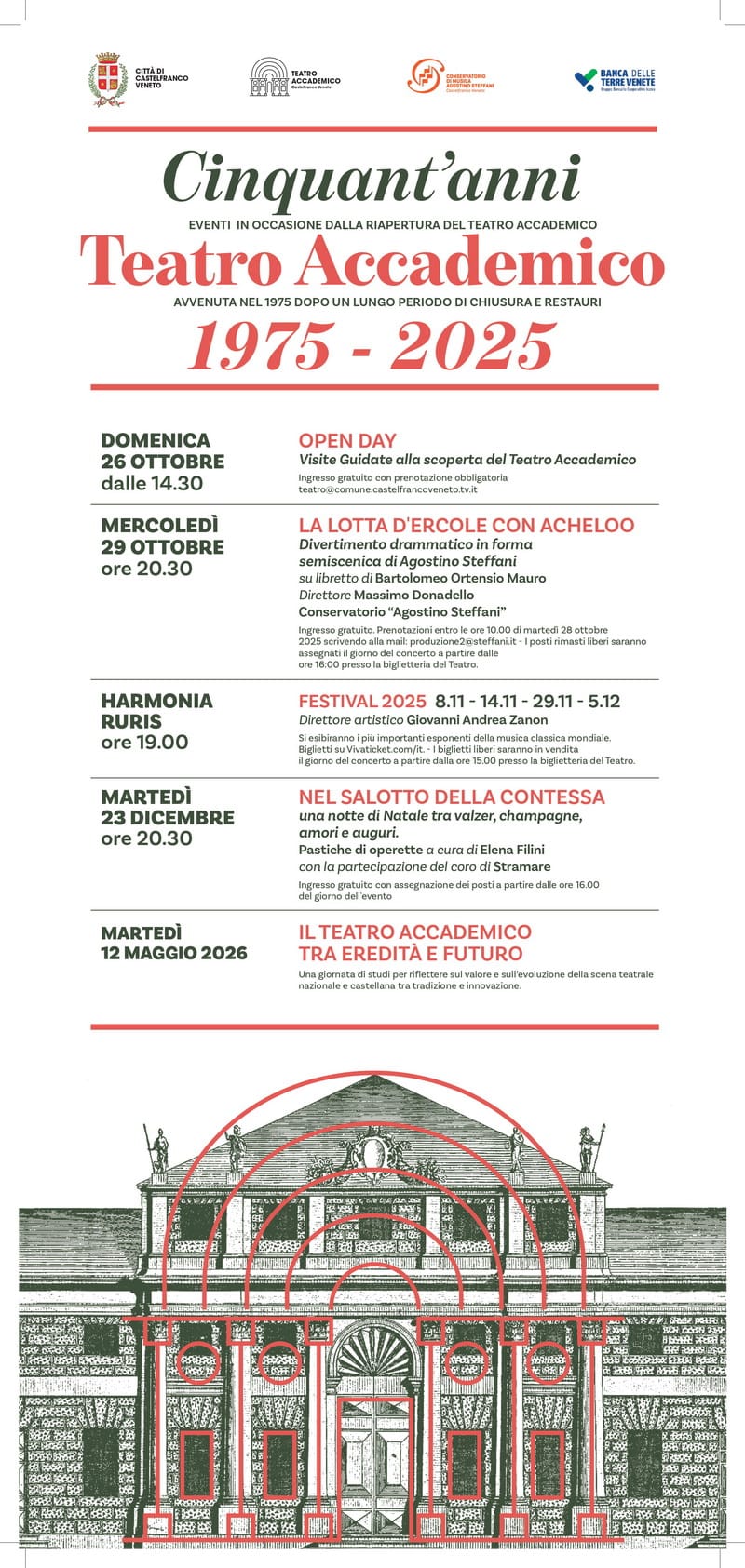 L’Amministrazione comunale di Castelfranco Veneto è orgogliosa di annunciare un ricco calendario di eventi in occasione del 50° anniversario della restituzione del Teatro Accademico alla città, avvenuta nel 1975 dopo un’importante opera di restauro e valorizzazione.