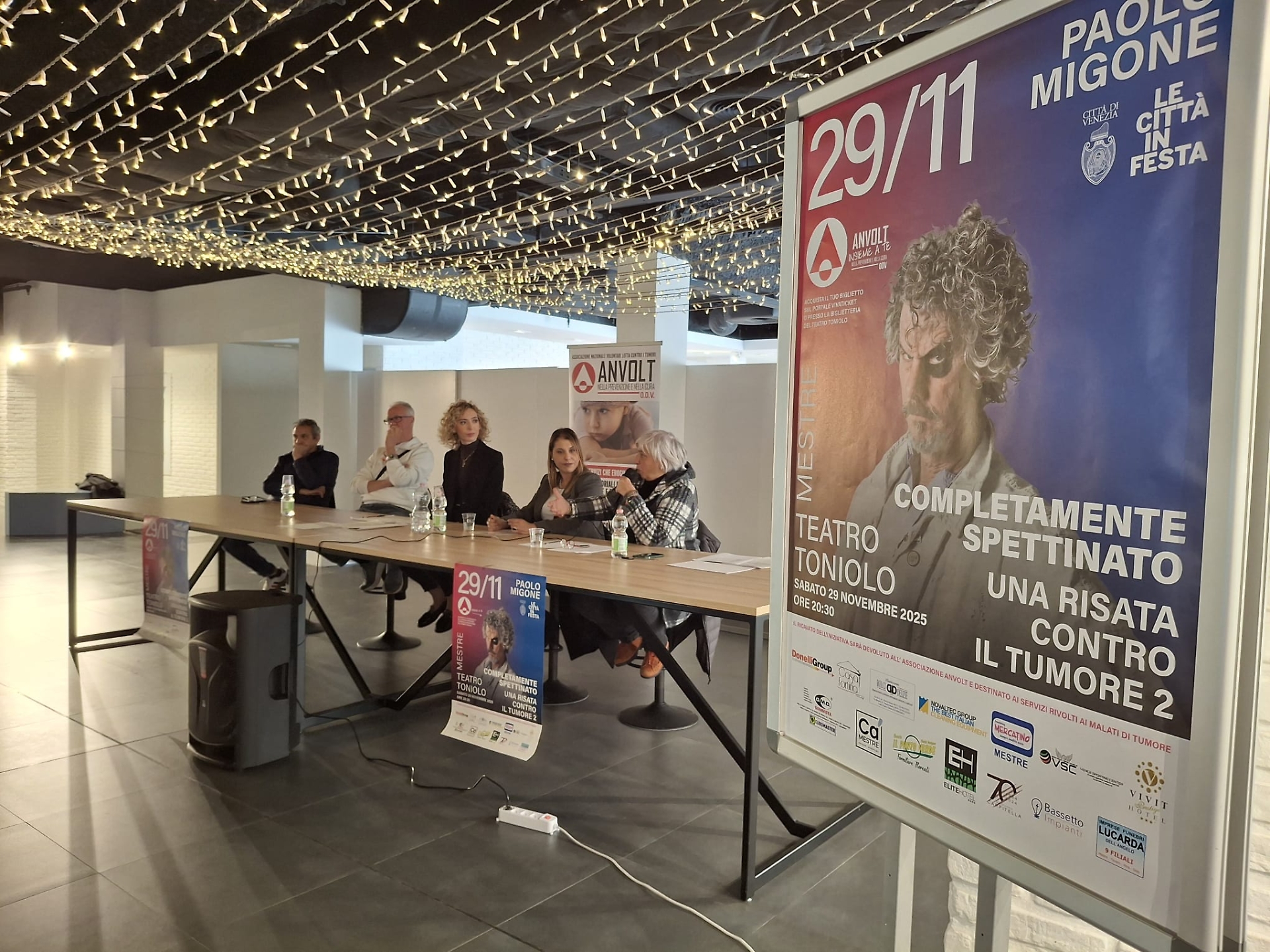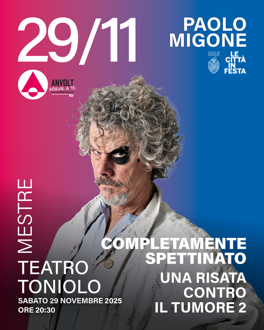 Dopo il grande successo della prima edizione, torna al Teatro Toniolo la serata benefica “Una risata contro il tumore 2”, organizzata da ANVOLT Mestre (Associazione Nazionale Volontari Lotta contro i Tumori, delegazione di Mestre O.D.V.). L’appuntamento è fissato per sabato 29 novembre alle 20.30, con Paolo Migone, noto comico di Zelig, che porterà in scena il monologo “Completamente spettinato”, affrontando con ironia e leggerezza temi come l’amore e la vita quotidiana.