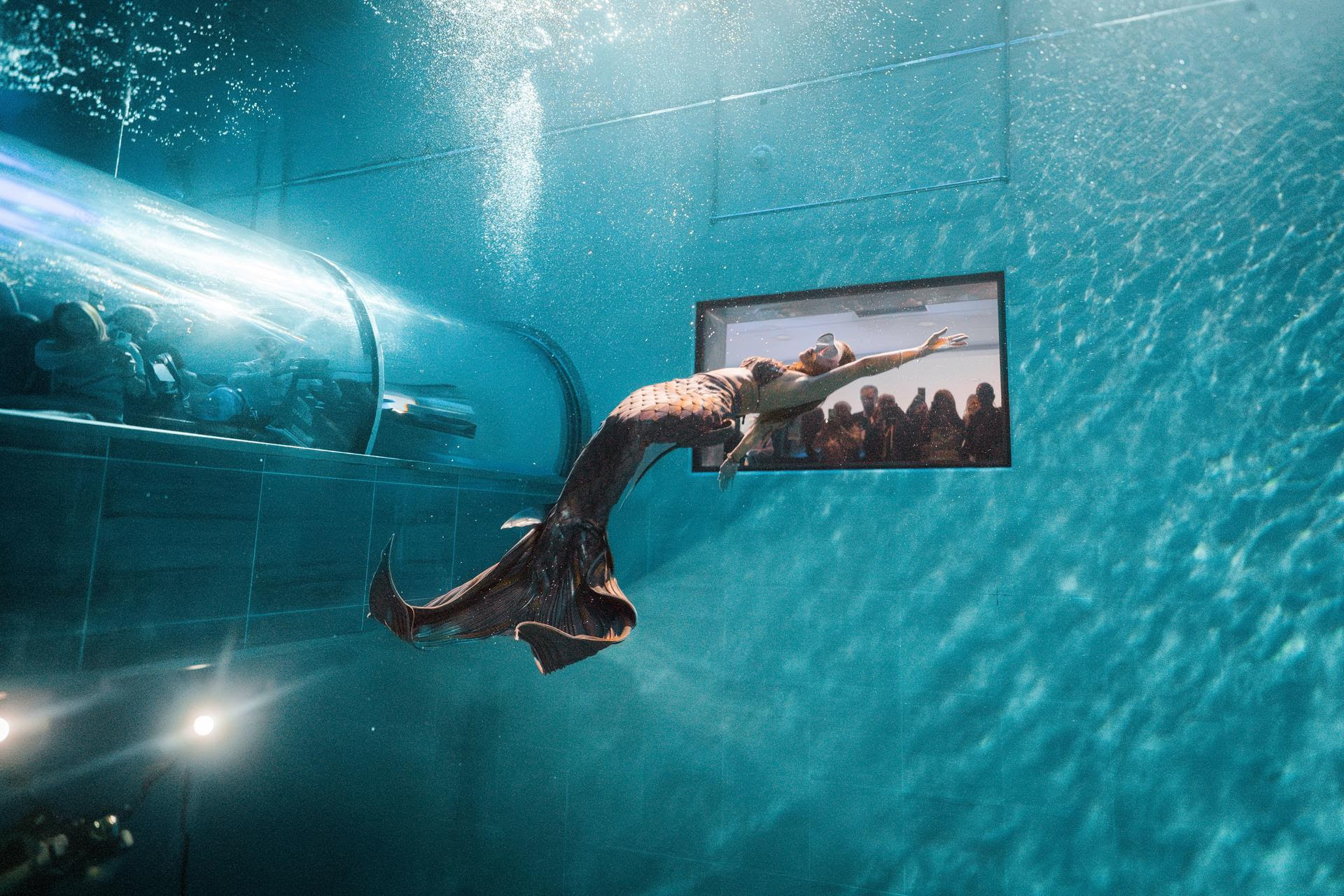 Le protagoniste dello show sono Paola Zanaga, agonista di apnea della squadra Y-40, Mia Guastadisegni, istruttrice di mermaiding, Gabriela Felicioni, campionessa di apnea della Slovacchia, Serena Bonato e Giulia Silvestri, entrambe apneiste di Y-40, accompagnate dal tritone Samuel Parodi. Le loro coreografie in musica verranno ammirate sia attraverso le finestre e il tunnel subacqueo situato a cinque metri di profondità, sia da chi si è immerso personalmente per vivere l’esperienza da vicino.