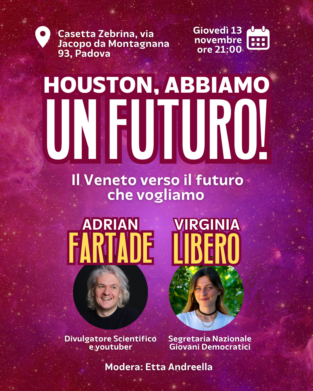 Con queste parole Virginia Libero, segretaria nazionale dei Giovani Democratici, presenta la serata di confronto con il divulgatore scientifico Adrian Fartade, mediata da Etta Andreella, che si terrà giovedì 13 novembre alla Casetta Zebrina alle ore 21.00.