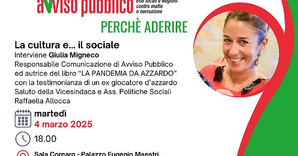 L'evento vedrà l'intervento di Giulia Migneco, Responsabile Comunicazione di Avviso Pubblico e autrice del libro "La pandemia da azzardo", con la testimonianza di un ex giocatore d'azzardo. La serata sarà aperta dal saluto della Vicesindaca e Assessora alle Politiche Sociali Raffaella Allocca, che ha sottolineato l'importanza di affrontare il fenomeno della dipendenza da gioco d'azzardo con un approccio multidisciplinare: "Si tratta di un problema che mina la salute mentale, le relazioni familiari e la stabilità economica. Nel 2022 in Veneto si contavano 1.419 utenti con disturbo da gioco d'azzardo, di cui il 16% nell'Ulss 6 Euganea. Serve un impegno collettivo per contrastare questa piaga."