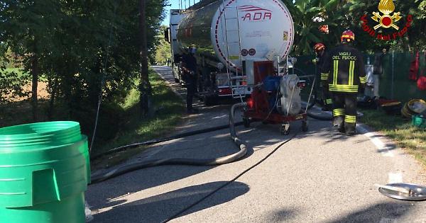 I pompieri hanno predisposto le operazioni di travaso dell'idrocarburo da un'autocisterna finita fuori strada a Noale a un'altra cisterna