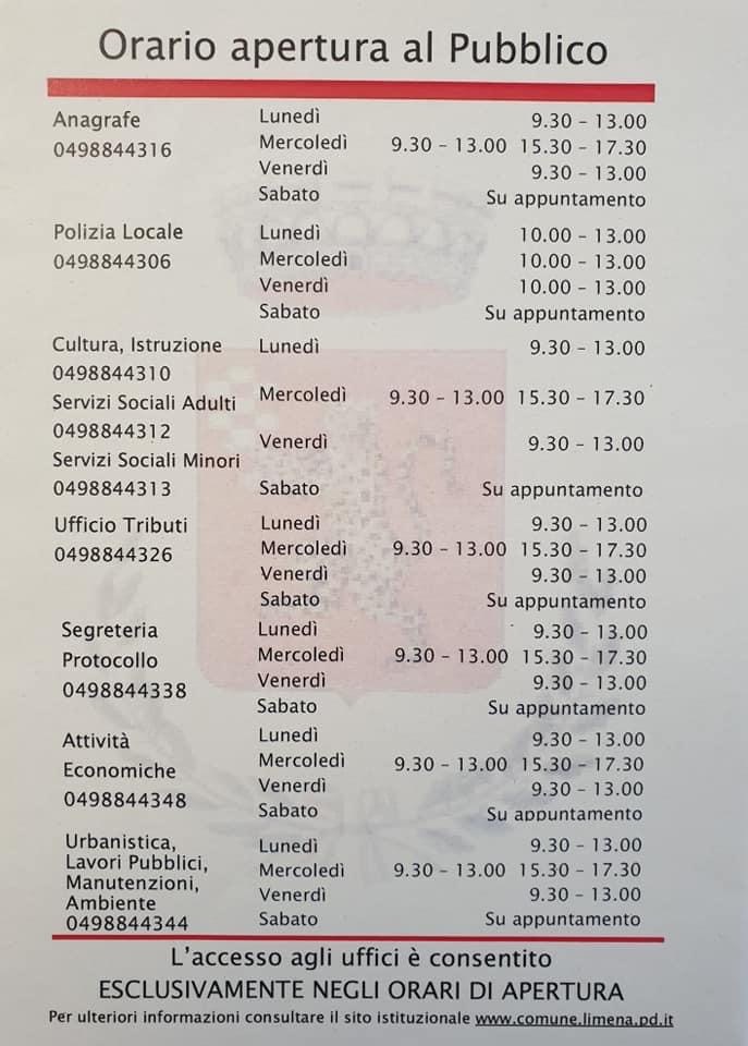 “Si è voluto unificare il più possibile gli orari e i giorni di apertura di tutti gli uffici - spiega il Sindaco di Limena Stefano Tonazzo - Inoltre da questa settimana è attivo il sistema eliminacode con totem per richiedere il servizio dell'ufficio interessato. Il Comune finalmente riaprirà le porte, data la chiusura dovuta ai protocolli covid, e sarà messa a disposizione la sala consiliare come sala d'attesa per aspettare il proprio turno”.“Per i prossimi mesi il Comune - aggiunge Tonazzo - ha investito per una addetta incaricata ad aiutare l'utenza nell'utilizzo del sistema eliminacode e per la registrazione della temperatura corporea all'ingresso. Ci scusiamo per il disagio in questo lungo periodo di chiusura, dovuto alla normativa anti-covid, speriamo che le azioni messe in campo possano avvicinare sempre di più il cittadino al Comune”. Fanny Xhajanka