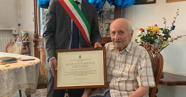È nato il 21 giugno del 1922 e oggi ha festeggiato il primo compleanno a tre cifre: il signor Augusto Capetta ha ricevuto la visita e gli auguri da parte del sindaco Filippo Giacinti. Capetta festeggia questo speciale compleanno con i suoi tre figli Michele, Maria e Patrizia, sei nipoti e tre pronipoti nella sua casa di via Roma.
