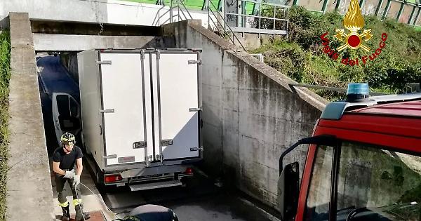 Grazie all'intervento dei pompieri di Padova, il furgone frigo che era rimasto incastrato è stato liberato