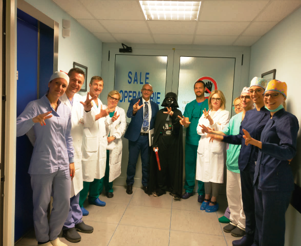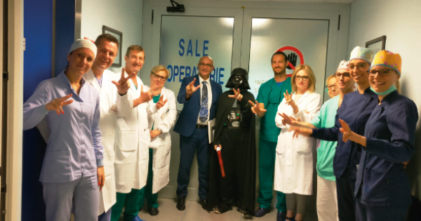 Da paziente a... super eroe di guerre stellari e la paura del dentista viene dimenticata nella sala dell’ospedale che, per l’occasione, si trasforma... in una nave spaziale. E così Thomas, un ragazzino autistico terrorizzato dal dentista che lo deve operare, in questo viaggio fantascientifico, ispirato alla saga cinematografica “Guerre Stellari”, vestito da Dart Fener, entra in sala operatoria e si lascia curare dall’équipe medica coordinata dal dottor Claudio Gallo. L’impresa eroica è avvenuta presso il servizio di Odontoiatria di comunità dell’ospedale di Piove di Sacco a cui i familiari si sono rivolti per le cure del giovane Thomas. L’approccio nella prima visita non è stato per nulla semplice e i medici hanno fatto fatica con il ragazzo che appariva emotivamente disperato, così come lo era la famiglia, incapace di trovare una soluzione in una situazione di difficile gestibilità. Anche perché Thomas aveva bisogno di un intervento chirurgico. “Come sempre - racconta il dottor Gallo - abbiamo chiesto ai genitori se c’era qualche particolare che poteva facilitare la relazione del ragazzo con la nostra équipe”. E’ emersa dunque la sua grande passione per Star Wars, per i personaggi della celebre saga, in particolare per Dart Fener. “A quel punto abbiamo deciso d’inserire il ragazzo in una dinamica comportamentale di Guerre Stellari da svolgere – continua il medico - all’interno della nostra struttura ospedaliera e così facendo Thomas ha iniziato ad effettuare il ruolo di Dart Fener con tanto di vestito e maschera”. Questa dinamica ludica ha creato in Thomas una situazione emozionale così affascinante e piacevole che gli ha permesso di entrare totalmente a contatto con le varie “sezioni” della nave spaziale ospedaliera e poi di affrontare l’intervento con serenità. “Rassicurare per curare: è la cifra stilistica della storia di Thomas. Nessuna pozione magica, nessun incantesimo, nessuna volontà di spettacolarizzazione, ma l’approccio molto serio offerto dalla Medicina narrativa per aiutare l’assistito a sconfiggere la diffidenza, la paura, l’ansia dell’atto medico-chirurgicoanestesiologico” ha commentato il Direttore Generale dell’Ulss 6 Euganea, Domenico Scibetta. Ora Thomas- Dart Fener sta bene e non ha più quel doloroso mal di denti che ha creato tanti problemi al “super eroe”.